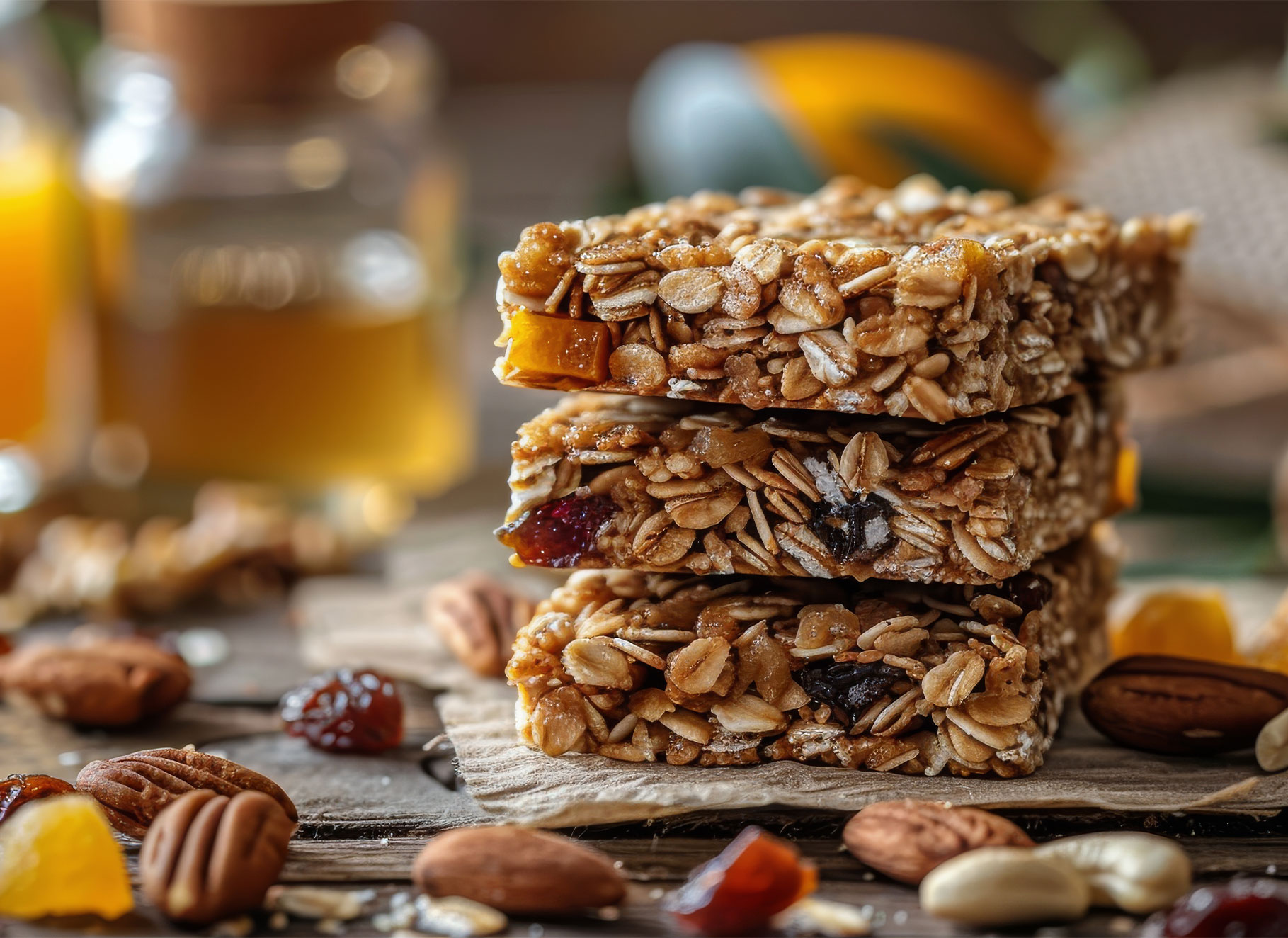 • 1 taza de nueces tostadas • 100 g de avena en copos • 1/3 de taza de pepitas de calabaza peladas • 2 cucharadas de jengibre fresco rallado • 1 cucharada de cúrcuma en polvo • 1 cucharadita de ralladura de naranja • El jugo de una naranja • 1 taza de zanahorias ralladas • Un puño de pasitas de uva o de arándano • 5 cucharadas de coco rallado